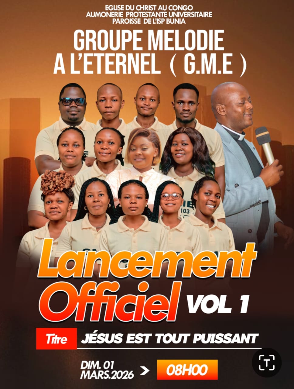 Le Groupe Mélodie à l’Eternel de l’Aumônerie Protestante de l’ISP/Bunia vous invite au lancement de son premier album ce dimanche 1er mars 2026 à 8h. Suivez.